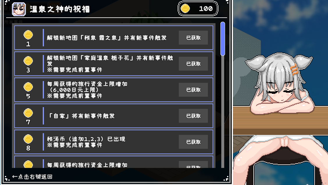 当你为温泉之神积累了足够的信仰后,你可以获得她的祝福,以解锁新地点、增加每周的旅行预算等等!
